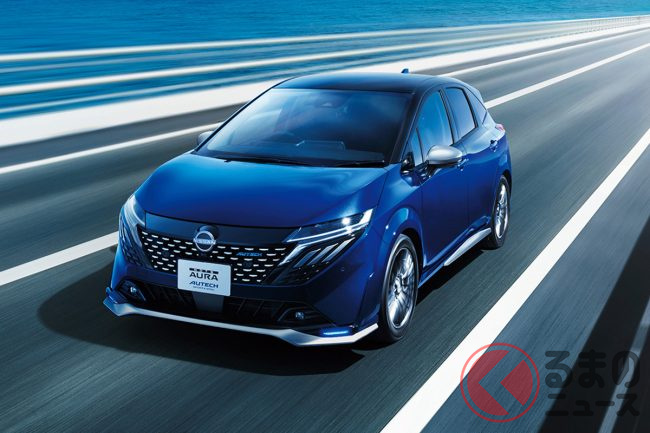 日産“新”「小さな高級車」公開! クラス超え「上質インテリア」×加速UPの“専用チューニング”実施! スポーツサスも装備の「ノートオーラ AUTECH SPORTS SPEC」2月に発売