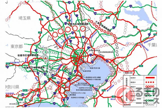 他には例えば、千葉県野田市から印西市のあたりを抜けて、大渋滞の国道16号の代わりになる「千葉北西連絡道路」も、この核都市広域幹線道路の一部として位置付けられています。神奈川県では首都高「横浜北西線」がそれに当たります。
