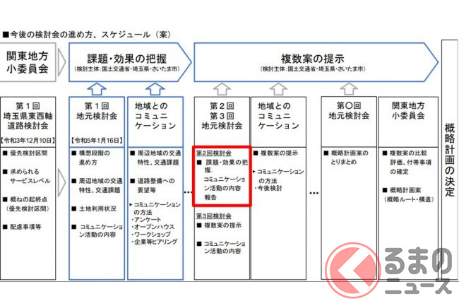 今がどこかというと、ちょうど1回目の2回目のあいだの「3案への絞り込み」が行われているところです。東北道のどのあたりに接続するのかをはじめ、地下トンネルなのか高架なのかといった基本構造も、おおかた絞り込まれます。