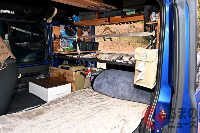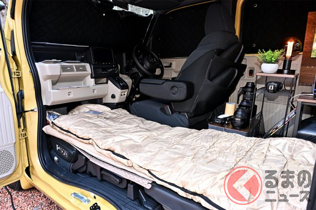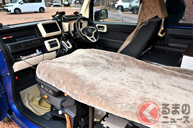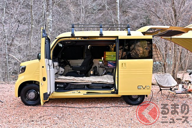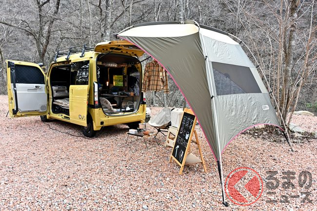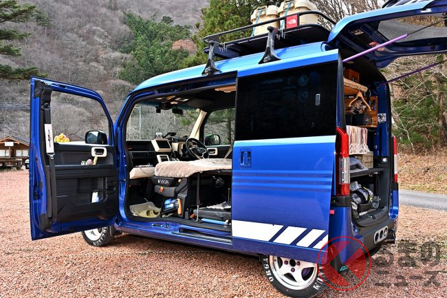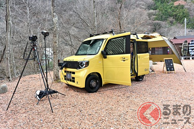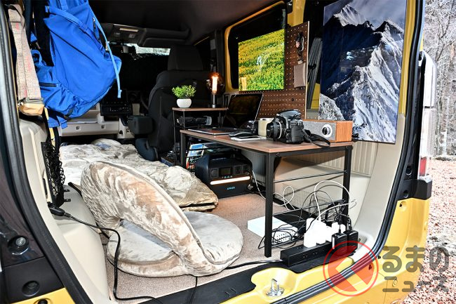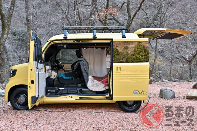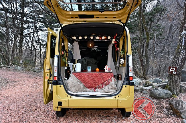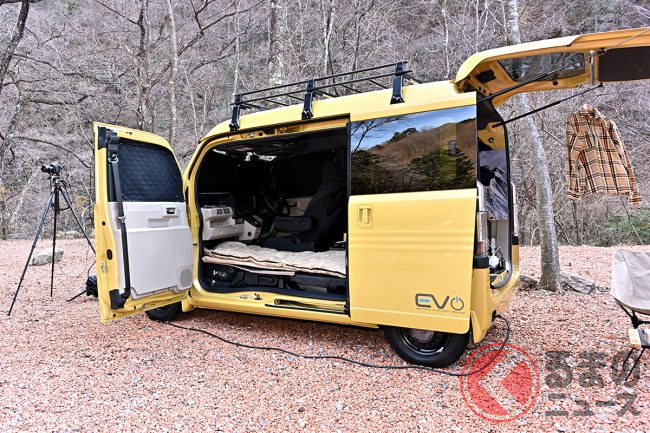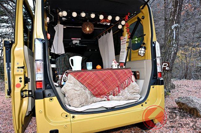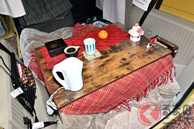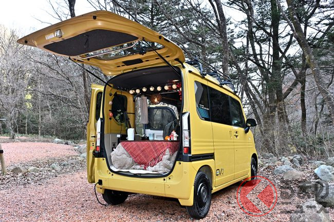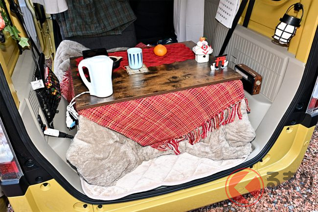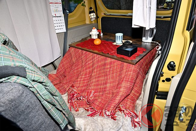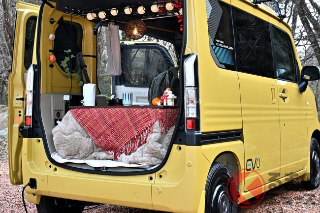 ホンダ「N-VAN e:」荷室に“コタツ”搭載!? 冬でもめちゃ暖かい「車中泊仕様」がスゴい! 電気を活用したアウトドアの提案とは?