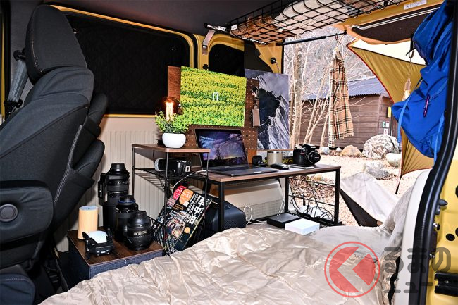 小川さんは「風景写真は自然の気象現象に左右されるので何日も天候待ちをする場合があります。また、朝焼けや夕焼けなどその時間に良いポイントにいないと撮れない風景もあります。すると必然的に車中泊を行うことが多くなってきます。そこで今回は撮影をしてその場で編集作業を行い発表できる環境と、待ち時間に車中泊ができる提案を行ってみました」と言います。
