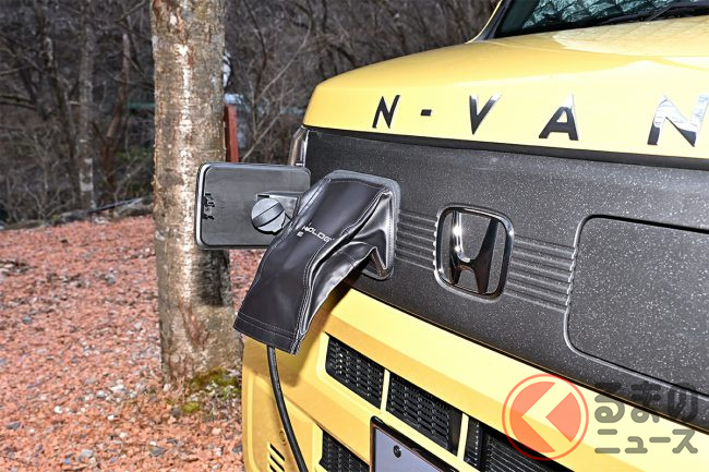 ノートPCやデータ保存用のハードディスク、Wi-Fiルーター、カメラのバッテリーの充電など何かと電気が必要になりますが、N-VAN e:の29.6kWhのバッテリーがあれば何も問題ないと言います。