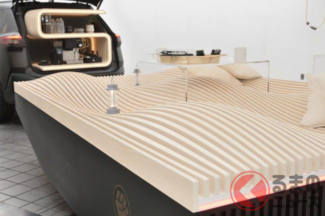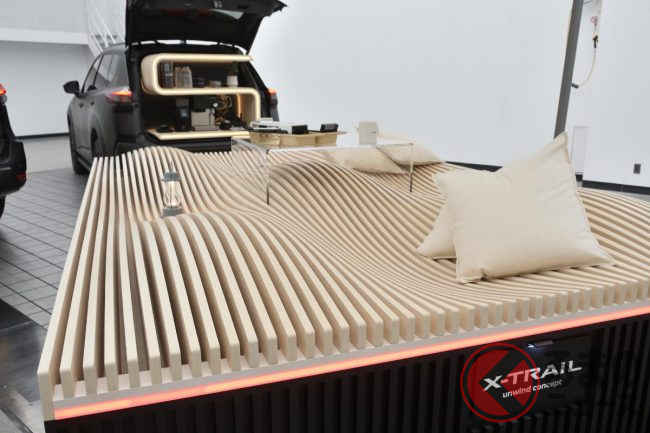 これはパラソルなどをトレーラー内に収納して現地に持っていく想定がされており、エスプレッソを楽しんだり、並んで展示される先代エクストレイルのレコードプレーヤーを楽しんだり、あるいは“推し活トレーラー”にするなど、インドア趣味をアウトドアにもっていく発想を表現しました。
