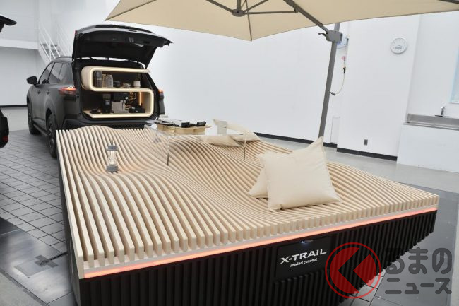 日産「新エクストレイル」初公開! ブラウン外装が超カッコイイ! テラスも付いてる&ウッドなS字棚も設置で“超チル”な「unwind concept」登場