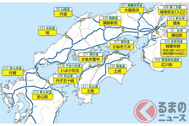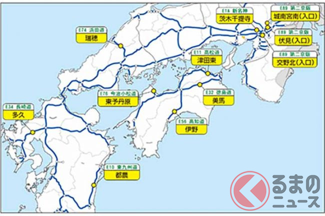 今回の対象料金所には、高松道の高松市内、名神の大津IC、第二京阪の鴨川西本線料金所、松山道の新居浜ICなどをはじめ、各都市部の料金所も含まれています。
