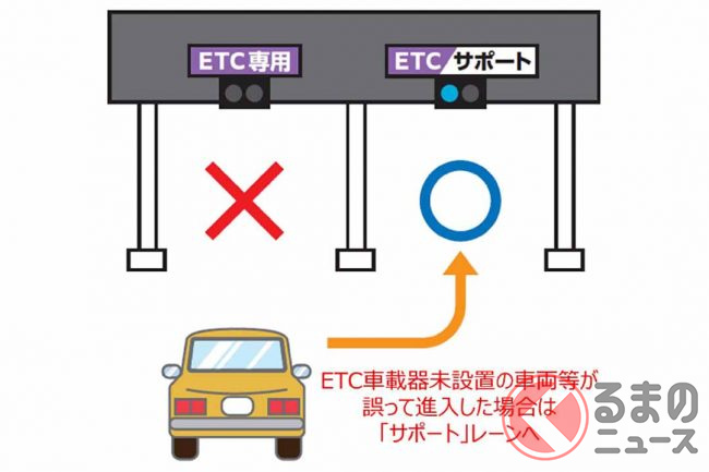 うっかり未搭載車で入ってしまった場合、「ETC/サポート」という表示のあるレーンへ進むことになります。インターホンなどで係員の指示に従うことになりますが、レーンに現金収受マシンが搭載されていて、そこで精算もできるといいます。