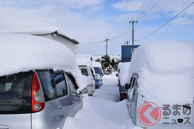 特に隣接する車両の間には風で雪が吹き溜まりやすく、クルマの周囲に雪が積もることで発進が難しくなることがあります。