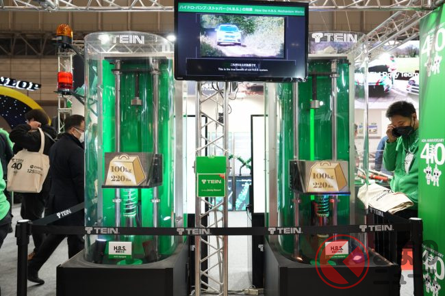 さらにテイン独自の機構であり、フルストローク時の衝撃をショックアブソーバ内部で熱エネルギーに変換し吸収することでクルマの挙動を乱す衝撃を小さくする同社の特許技術「ハイドロバンプストッパー」(H.B.S.)の効果がわかるデモ機なども展示されています。