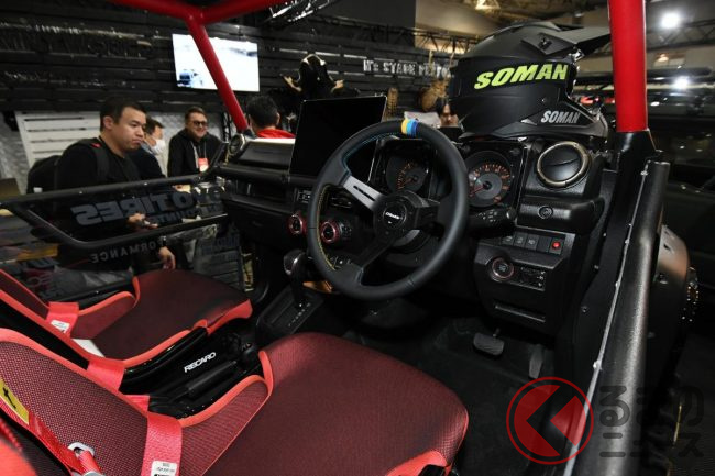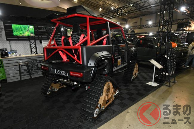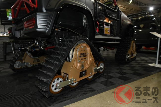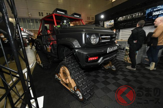 スズキ「ジムニー」は、4輪駆動ならではの走破性能の高さが魅力ですが、東京オートサロン2024にはその魅力を最大限に高め、一風変わったタフな足回りを採用したモデルが披露されていました。一体どのようなクルマなのでしょうか。