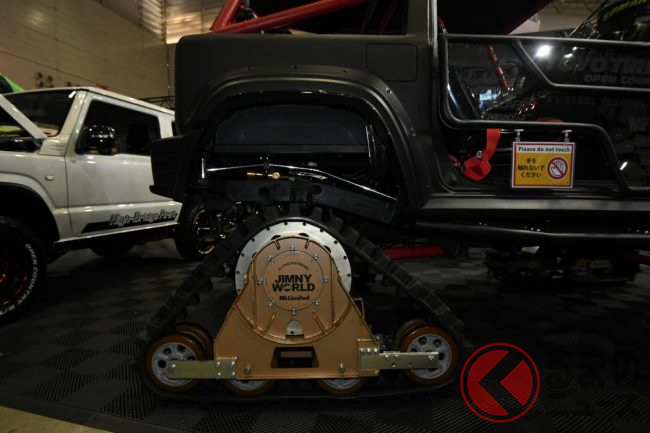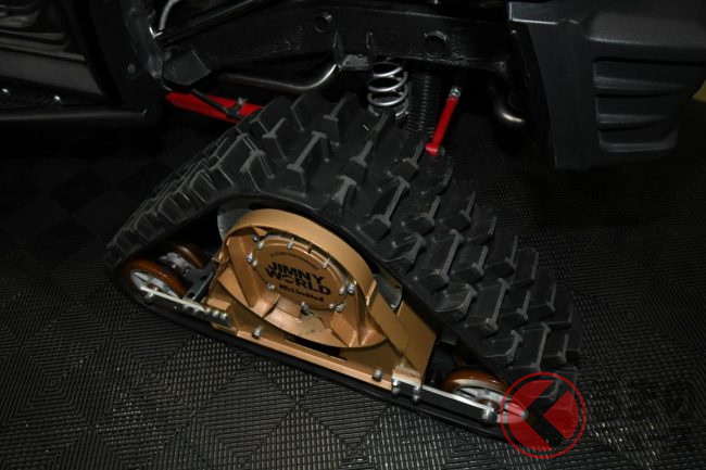 このクローラーは、タイヤを取り外してハブ部分に直接取り付ける設計となっており、ベース車両のジムニーは夏季には大径タイヤに戻すことができます。