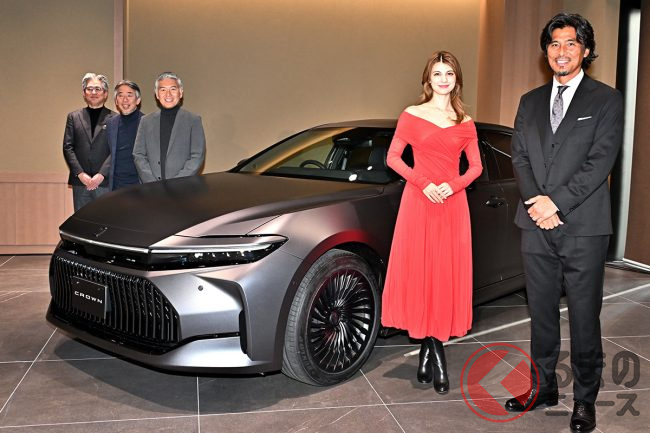 トヨタ「スゴいクラウン“セダン”」初公開! 精悍フロントマスク×ツヤなし“メタル塗装”がカッコイイ! 聖地「東京虎ノ門店」オープンイベントに登場!