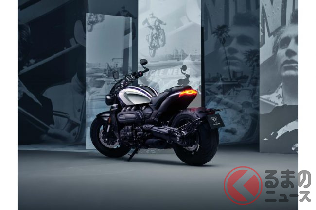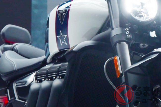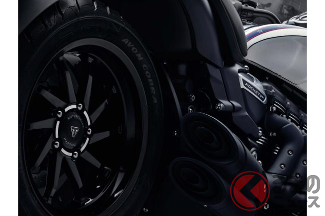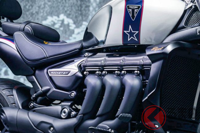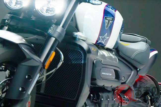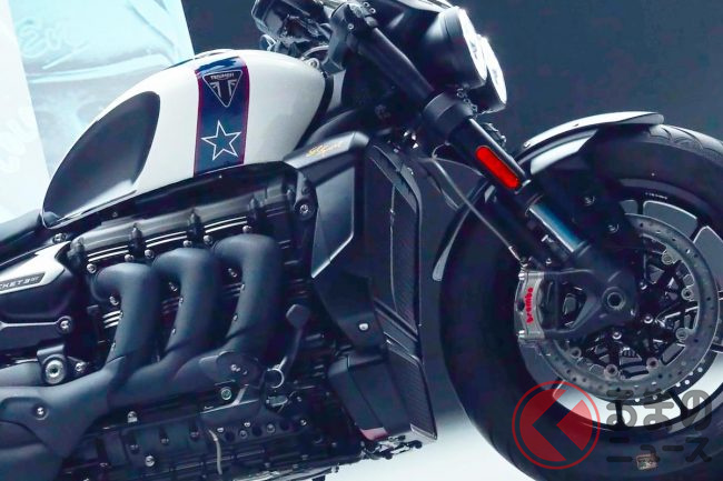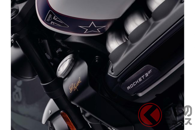 “2500cc”エンジン搭載する大型バイク公開に「デカすぎ…」の声! 超パワフルな「直列3気筒」に専用アイテム採用! トライアンフ「ロケット3」限定モデルとは!