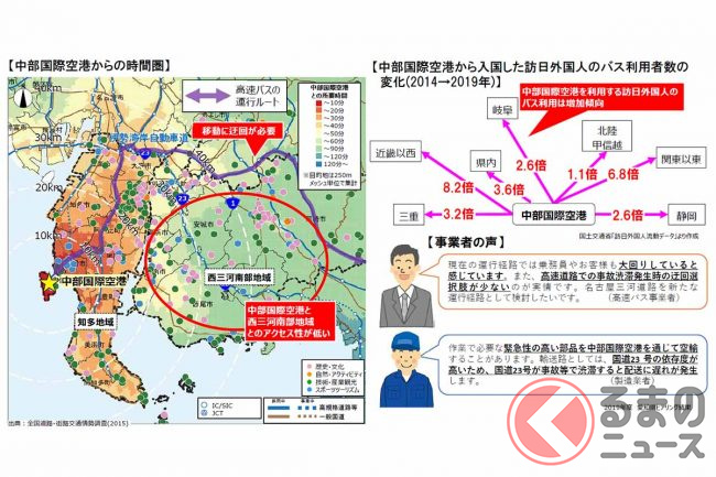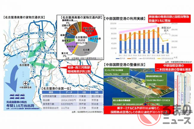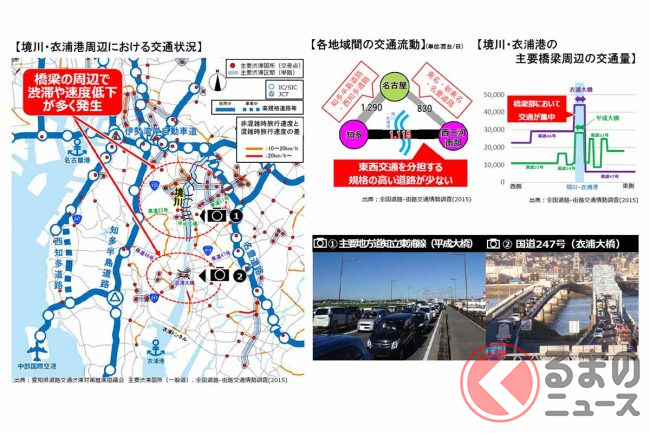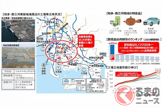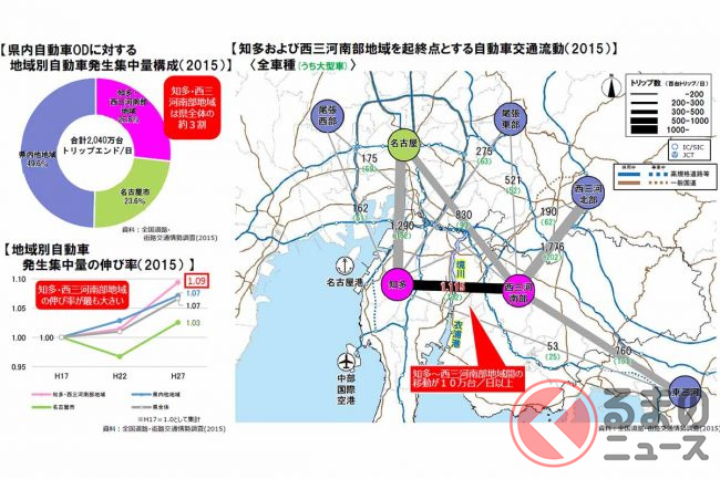 さらにこのエリアは知多の臨海部をはじめ工業地帯が多数ありますが、それを名古屋港や東名・新東名方面へ輸送する手段に乏しい状況です。