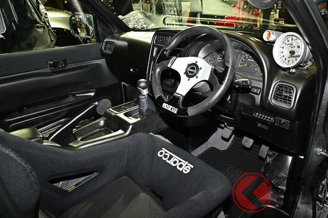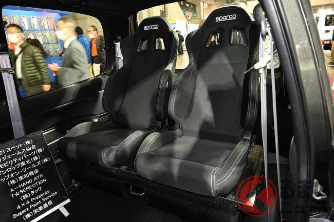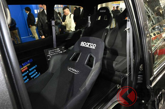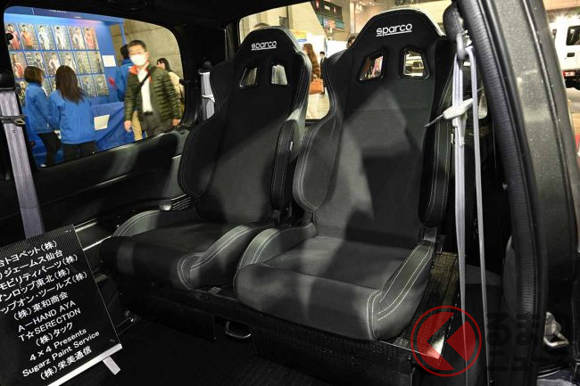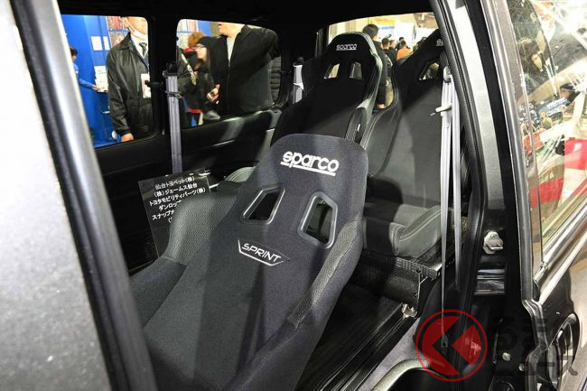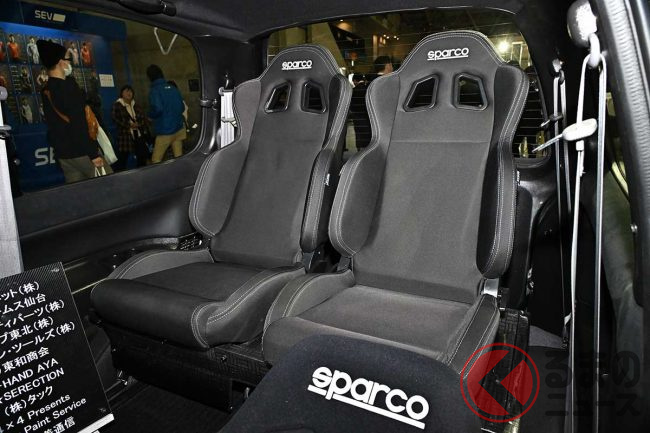 インテリアに目を移すと、フロントシートにはスパルコ製のフルバケットシートが2脚取り付けられ、後部座席では3列目シートを撤去して2列目にリクライニングバケットシートを設置。