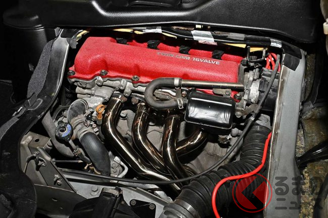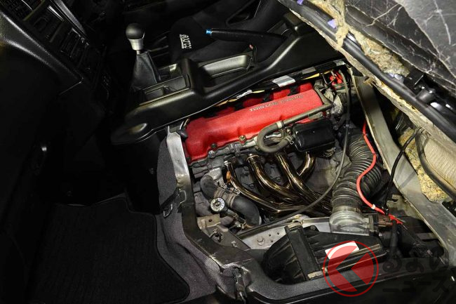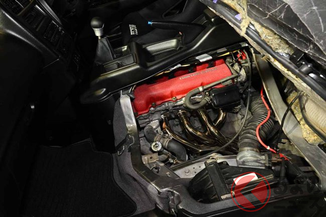 エンジン自体は自然吸気のままで改造はされていませんが、排気系には5ZIGEN製シルビア用エキゾーストマニホールドをベースにしたワンオフ品が装着され、独自のマフラーと組み合わせることでスポーティな走行感覚を引き立てています。