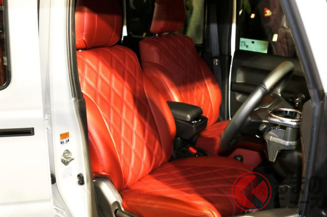 斬新「ジムニー5ドア」実車公開! 「Gクラス風」縦グリル&“左右マフラー4本出し”採用! 真っ赤な「豪華内装」もカッコイイ! エアロオーバー「G62L」東京オートサロン2025に登場!