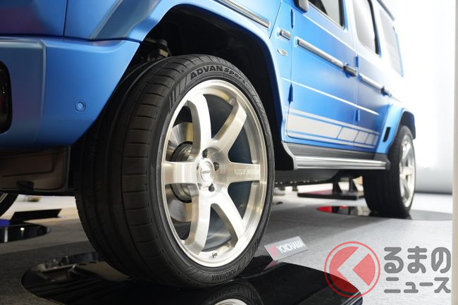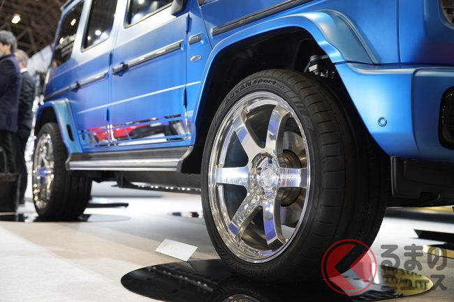 なかでも、目を見張るのが、ブルーのメルセデス・ベンツ Gクラスで、23インチのVOLK RACING TE37 GCを装着しています。しかも、両サイドで仕様が異なっており、3DのAST BLUSHEDとAST CRYSTAL BUFFと雰囲気の異なるホイールが装着されているところがポイントだと言えるでしょう。