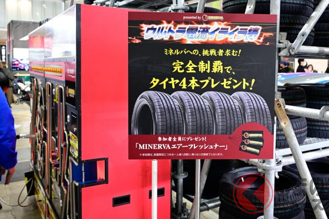 そのほか、体験コーナーとして、ゲーム「ウルトラ電流イライラ棒」のチャレンジも行われており、50秒で攻略した参加者にはベルギーのブランド、MINERVA製のタイヤが4本プレゼントされます。昨年のオートサロン2024で3日間合計でわずか3人しか成功例がなかったという難関ですが、MINERVAタイヤを自分のクルマに履いてみたい人は、チャレンジしてみてはいかがでしょうか。