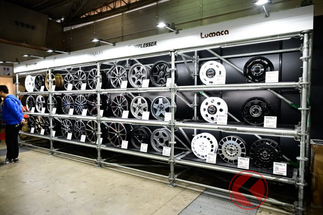これに加えてオートウェイの出展ブースで注目を集めていたのが、ホイールです。同社が取り扱っている7つのホイールブランドが勢ぞろいしており、オートウェイ専売モデルのエントリースポーツホイール「FINALIST」、オフロードカスタムに最適なOFFLESSER、プレミアムな雰囲気を持つLUXALESなどラインナップが豊富です。
