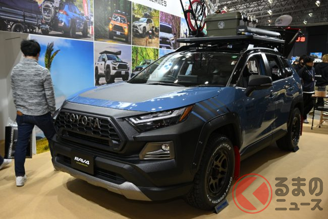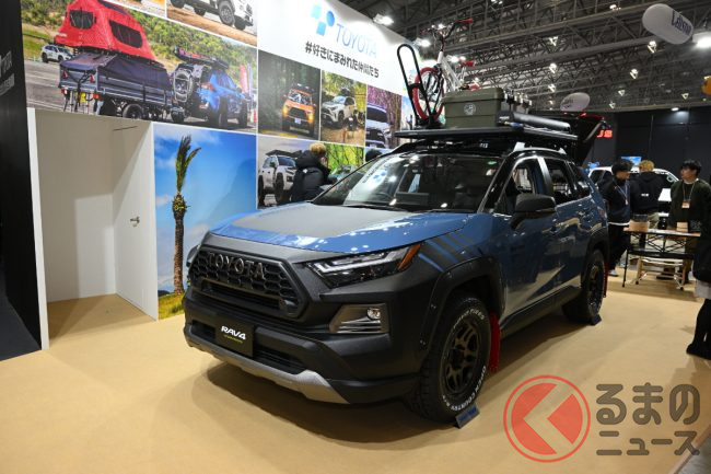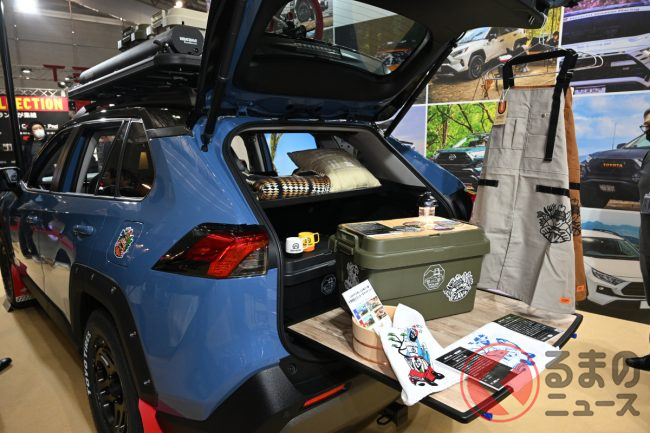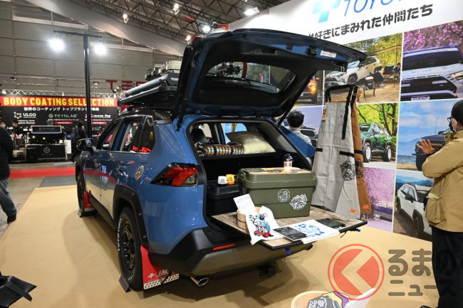 コンセプトモデルの「アウトドアライフスタイルパッケージ」では、さらにJAOS製のフェンダーガーニッシュやマッドフラップ、後部に参考出品の引き出し式テーブルを追加。足回りはトーヨータイヤのOPEN COUNTRY A/TIII+DELTA FORCEの新作アルミホイール「OVERLANDER」で引き締めており、RAV4が持つラギッドでワイルドな印象を一層アップさせています。