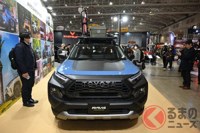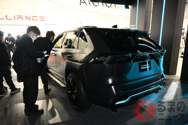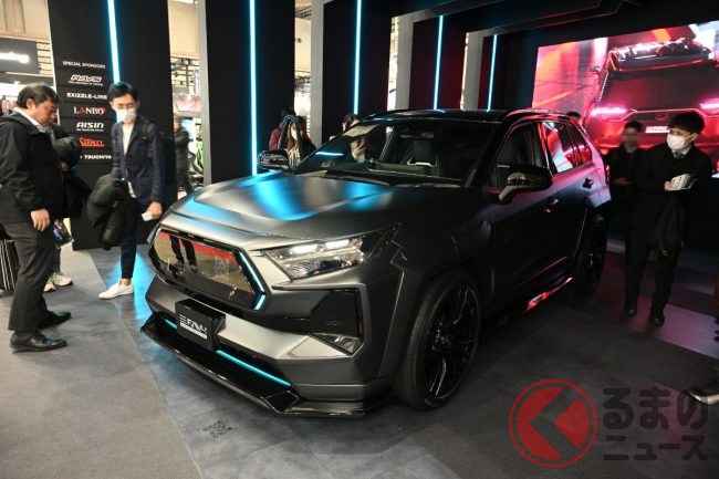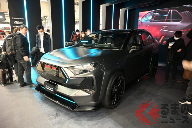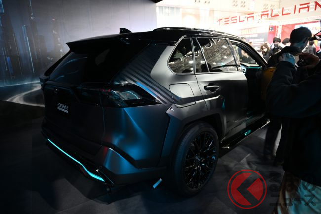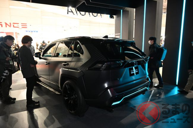 光るグリル&バンパーがスゴイ! ワイドボディのトヨタ「RAV4」初公開!? まさに“ミステリアスSUV”な豊田自動織機のカスタムカー「DARK SIDE PERFORMANCE」とは