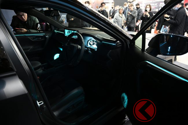 真っ暗な内部に青い光が輝くブース内に置かれた「DARK SIDE PERFORMANCE」のボディカラーは、ショーモデル用に特別に作られたマットブラック。明るい光さえ吸収してしまうそのブラックはまさに漆黒で、SFのダークヒーローが乗るクルマのような雰囲気を放っています。フロントや車内に配されたブルーのイルミネーションも、それをさらに強調しています。
