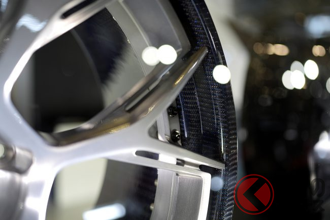 カーボンの柄は、クラッシュドカーボン、格子状、カラーカーボンの3種類が用意されており、さらにピアスボルトのカラーリングも選択でき、オーナーの好みに合わせたオーダーメードのホイール作成が可能です。価格は1本約100万円からとなっていて、カスタム内容によって変動するそうです。