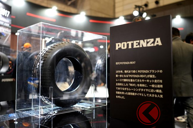 ブースの正面には、1979年に誕生した初代POTENZA(ポテンザ) RE47が展示されており、それを取り囲むように現在のPOTENZAが並べられていました。