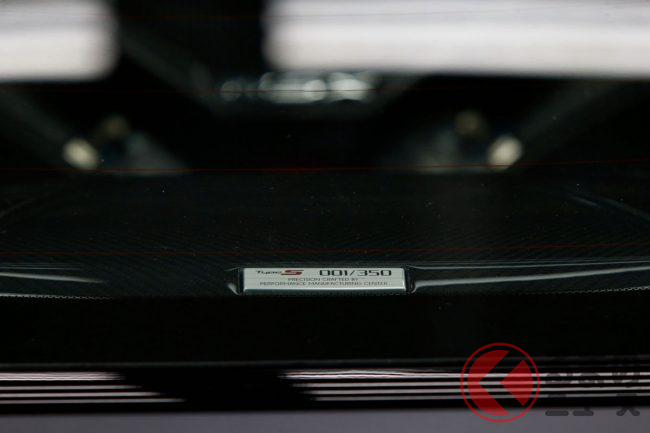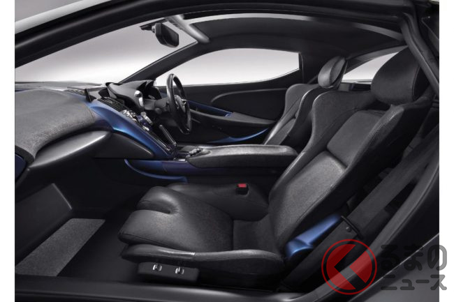 また、「スポーツマインドを駆り立てる」と表現されたインテリアでは、コックピットにインパネ骨格をイメージした軽量で剛性感のあるデザインを採用。ブラックやブルーのカーボン、カラードアルミ、結晶アルミ、ヌバック革などの異素材を巧みに組み合わせ、新次元のピュアスポーツにふさわしいインテリアを実現していました。