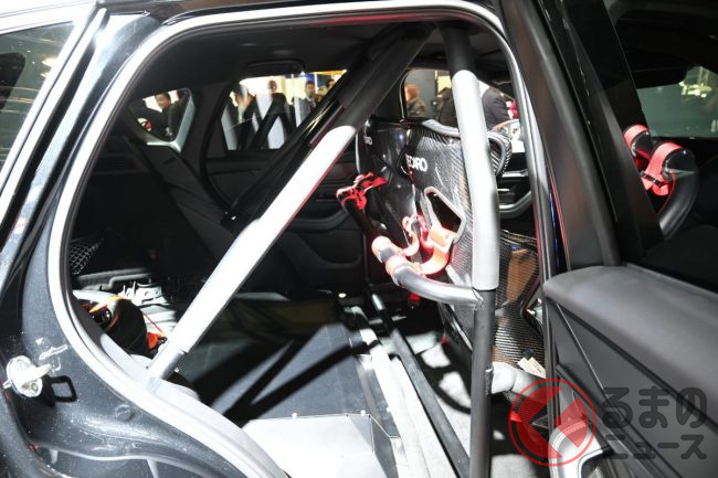 そのうえ室内にはごついロールバーが張り巡らされ、見るからに競技車両の雰囲気。いっぽうでダッシュボードなどコックピットまわりはアルカンターラ張りとするなど、(フルバケ&リヤシートレスやロールバーとは対照的に)単にスパルタンなだけでなく上質な雰囲気も感じさせます。