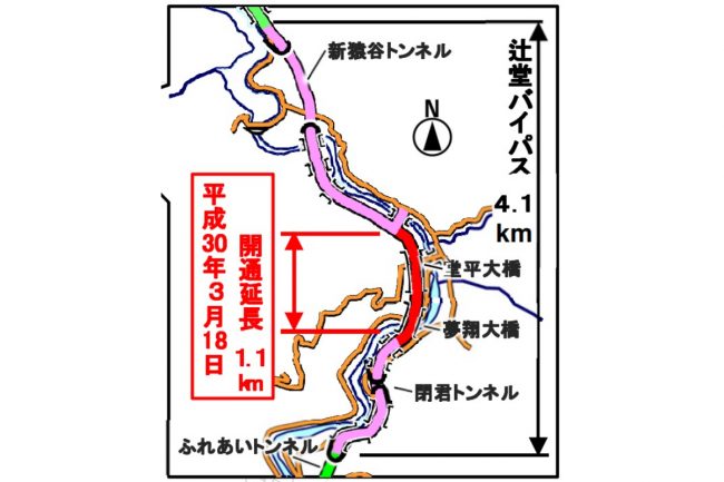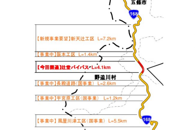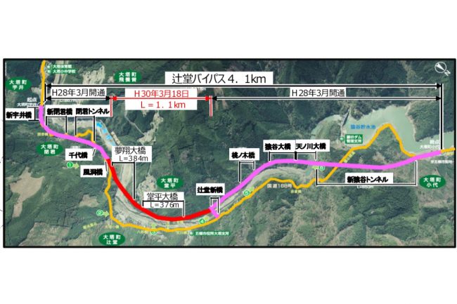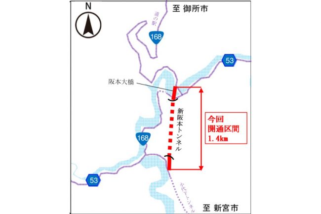 2018年に事業化。天辻峠を丸ごと長大トンネルでワープするもので、宗川野から阪本大橋までほぼ直線で一気に抜けていきます。古来から未開業の「国鉄五新線」の長大トンネルが掘られていましたが、それに並行する形です。