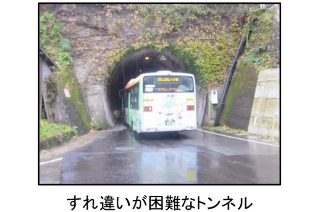 2024年3月に開通したばかり。谷斜面にへばりつくような細道区間で、バスが離合不可能な狭い隧道もあるクネクネ区間を、トンネルで一気にワープします。