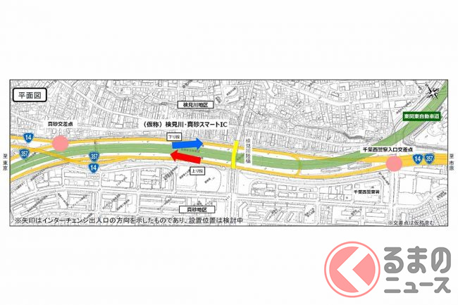 そこで検見川・真砂スマートICを設置することで、国道14号を直進するだけで東関東道へ乗ることができるようになり、穴川IC方面への交通流をこちらへ分散させて混雑緩和させる狙いもあるのです。