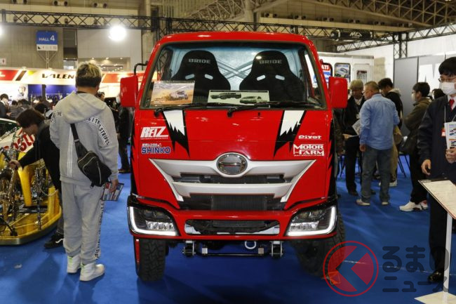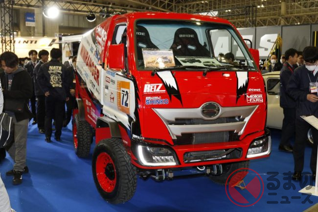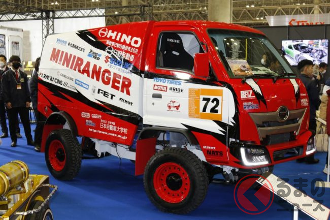 斬新「“2人乗り”ジムニー」初公開! まさかの「日野トラック顔」&軽トラ荷台を合体! “タフ感”マシマシなラリー仕様のNATS「ミニレンジャー」東京オートサロン2025に登場!