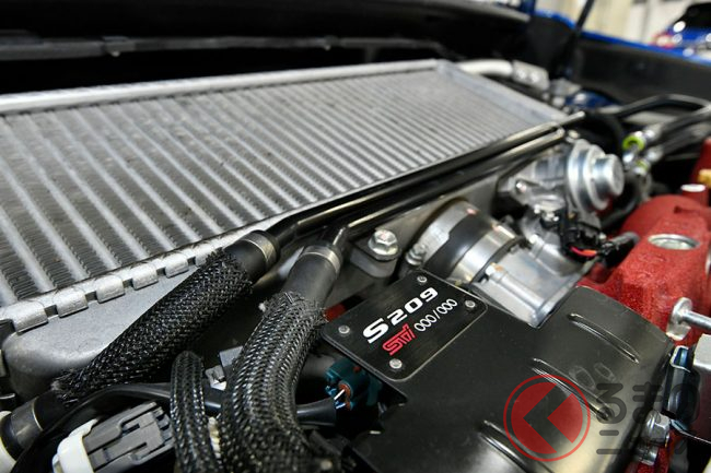 そんなS209で特に気合の入ったカスタムが施されているのはエンジンです。米国向けのWRX STIに搭載されていた2.5リッター水平対向ターボエンジン「EJ25」に、専用開発の大径ターボチャージャーや専用ECUを装備。これを6速MTで操ります。
