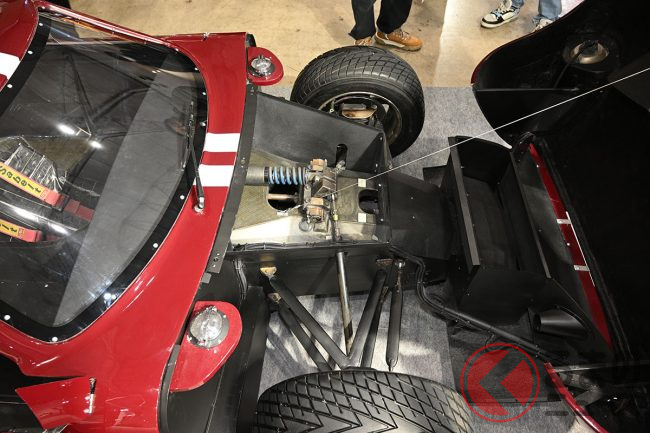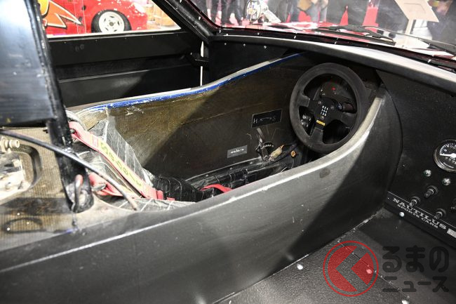 気になる内部はパイプフレームシャーシと、無限製4気筒レーシングエンジン+ヒューランド製トランスミッションを組み合わせで、車内を除くと座席はセンター配置となっていますが、これは試作1号車であるこの展示車の特徴。