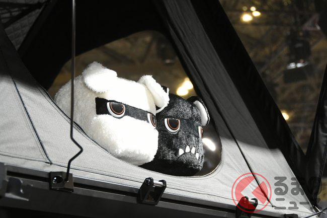 余談ですが、デリカD:5ブラックエディションASの周辺には、デリカシリーズのマスコットキャラクター「デリ丸。」のグッズが多く配置。特にテントからのぞく白と黒の2匹のデリ丸。は、その可愛らしさで訪れたお客さんを和ませていました。