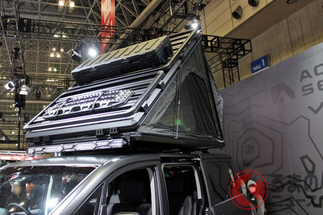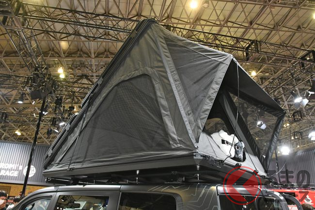 最大の特徴は、ルーフに設置された2階建てテント。実際にオートサロン2025の三菱ブースへと足を運び、展開した2階建てテント(ルーフテント)の高さに驚いた人もいるのではないでしょうか。