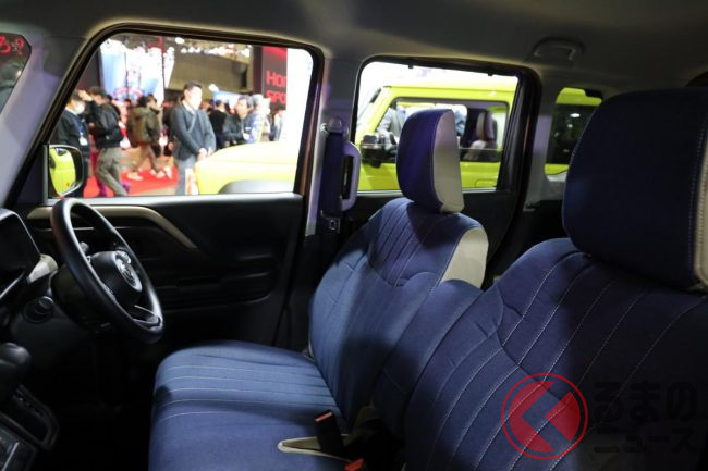 展示車の足元は、同社の1ピースホイール「ヴェルズクロス DR」の15インチ×5J+45サイズに、165/65R15サイズのヨコハマ製オールテレーンタイヤを組み合わせて装着し、オフロードスタイルのアクティブ感を強調。