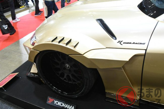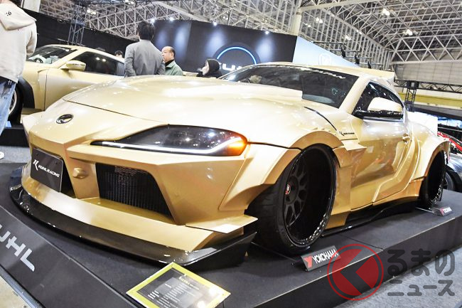 さまざまなカスタムモデルが登場するなか、トヨタ「GRスープラ」をベースとしたゴールドカラーの「KUHL 90R-GTWR SPEC-D WIDE」が来場者の注目を集めていました。