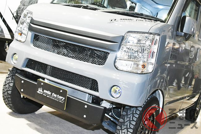 なかでもスマイルファクトリーが、スズキの軽ワンボックスバン「エブリイ」をリフトアップし、グッとタフなイメージに仕上げた「オフタイムBASE」を出展し、来場者の注目を集めていました。