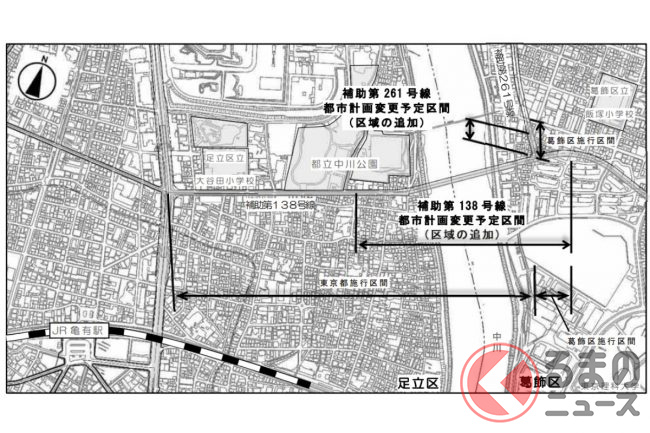 足立区と葛飾区は2025年1月17日、都市計画道路「補助第138号線」(中川工区)について、都市計画変更素案を取りまとめたと発表。住民説明会を順次行うとしています。