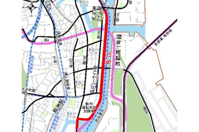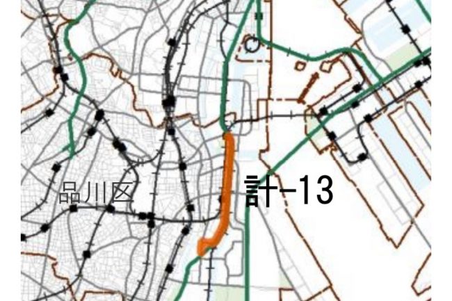 「京浜運河の上部に計画されている都市計画道路であり、残る区部の骨格幹線道路として、事業の実現性や施工性の観点から検討が必要です」という扱いで、「廃止保留」のようなニュアンスも感じられます。