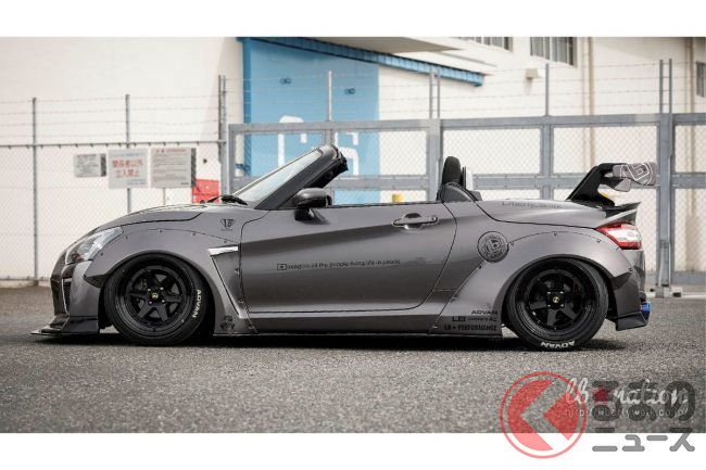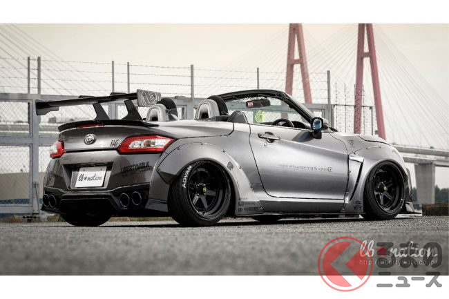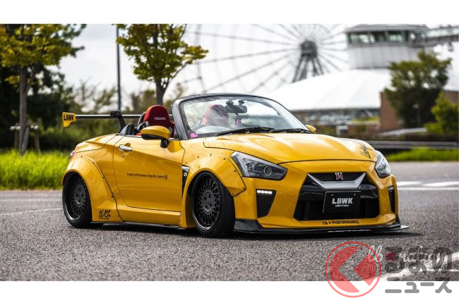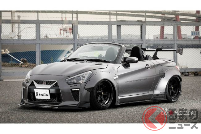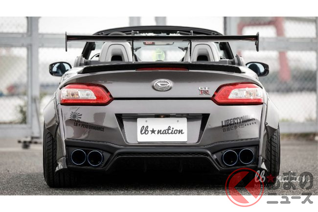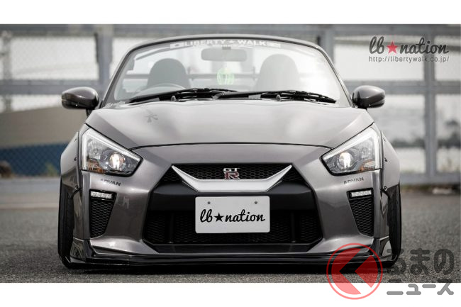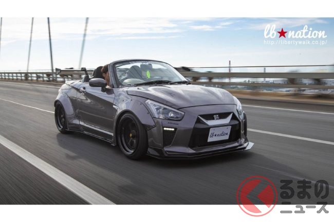 日産「“ミニ”GT-R!?」公開!? まさかの“軽規格超え”の「コペン」ってマジ!? 4本出しマフラーも完全再現なリバティウォーク「DAIHATSU COPEN GT-K Type.2」とは