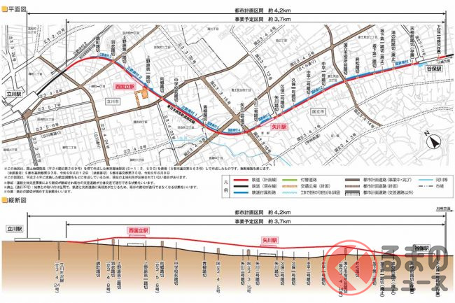 この次の延伸工区では、いよいよ西武国分寺線をアンダーパスで抜けていきます。現地ではすでにアンダーパス建設の準備が進んでいて、まずはアンダーパス内の雨水を排水するための施設整備が先行して行われているところです。工区全体の用地取得はほぼ終わっています。