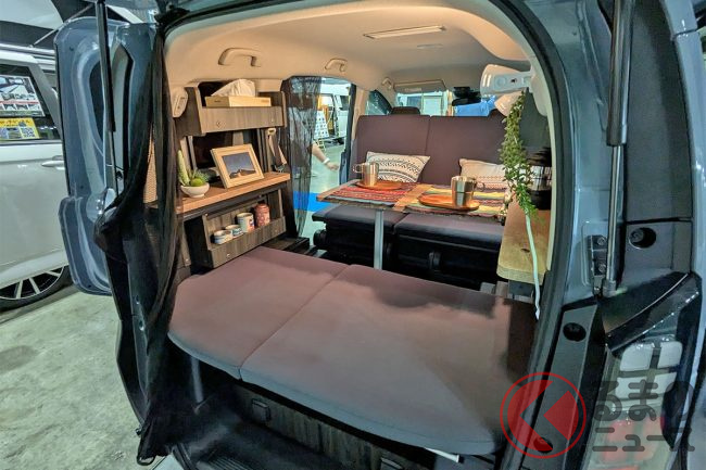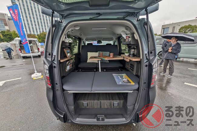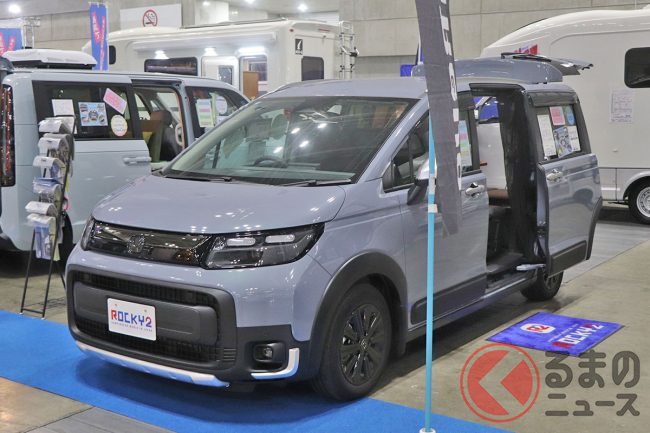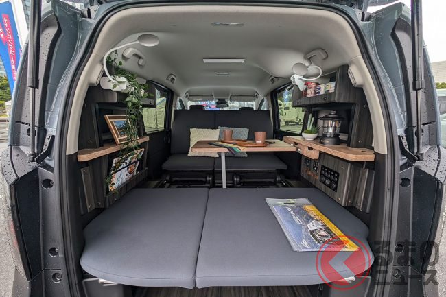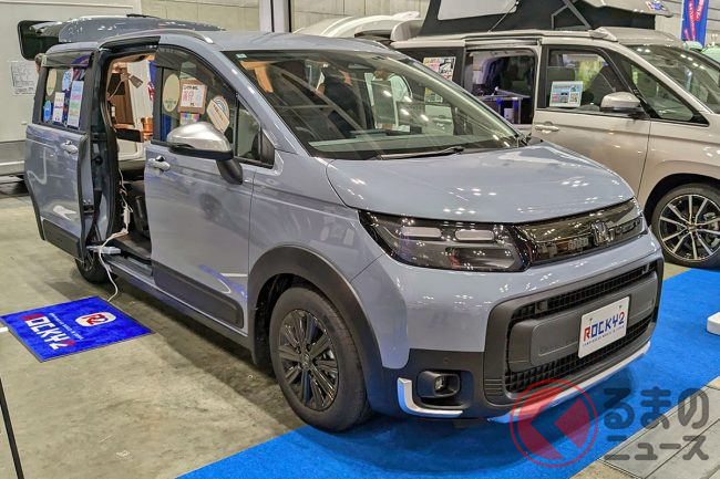 ホンダ“最新”「フリード」の「キャンピングカー仕様」公開! 広々「ダブルベッド」ルームは「断熱×電装」も完備! 斬新「車中泊モデル」ロッキー2「マウンテンビレッジ」TASに登場