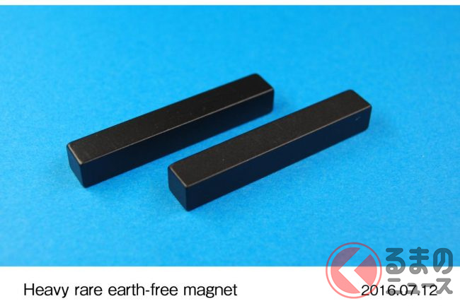 ハイブリッド車の駆動モーターには、強力な磁力を持つネオジム磁石が使用されていますが、モーターが高温環境下で作動するため、従来は耐熱性を確保するためにジスプロシウムやテルビウムといった重希土類元素が添加されてきました。