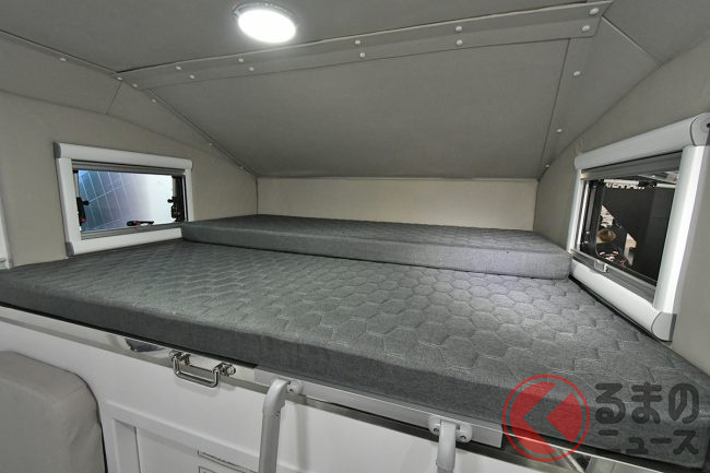 乗車定員はキャブ側に3名、キャビンに4名の計7名。コンパクトなボディサイズながら、就寝スペースは運転席上方にあるスペースに3名、下側にマットを敷き詰めて3名、合わせて6名が同時に就寝可能な広い空間を確保しています。