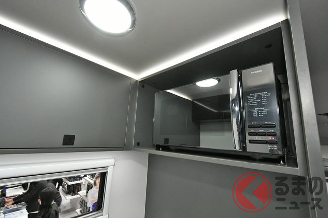 キッチンはもちろん、テレビや電子レンジ、冷蔵庫、エアコンまで装備。アルミボディには断熱材が使われており、夏の暑さや冬の寒さに対しても、エアコンがしっかりと効くように対策されました。