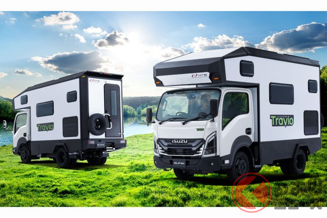 このエルフミオに、テーパーサス、リアスタビライザー、ジェネレーターなど、キャンピングカー向けの専用装備を多数採用し、快適な乗り心地と優れた安定性を実現したキャンピングカー専用シャシが「トラヴィオ」です。